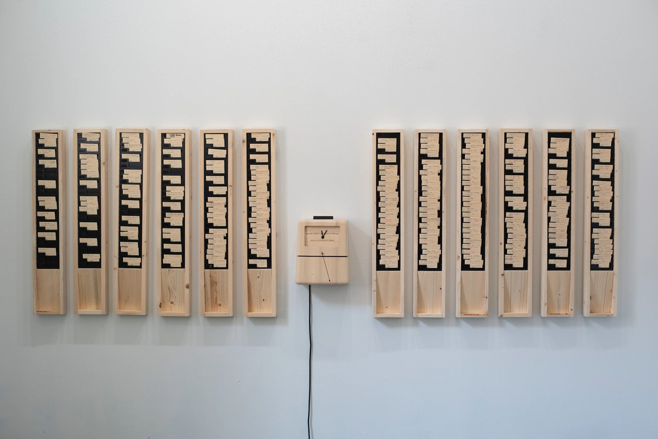 In contemplation of the US as my home, I mused about The Liberty Bell as an iconic symbol of American freedom; its tolls loudly announced the Declaration of Independence. To many, this bell represents the declaration of false freedom, liberty, and unity. This resulting piece, Labor of Liberty, is a manual punch clock that resembles the Liberty Bell.